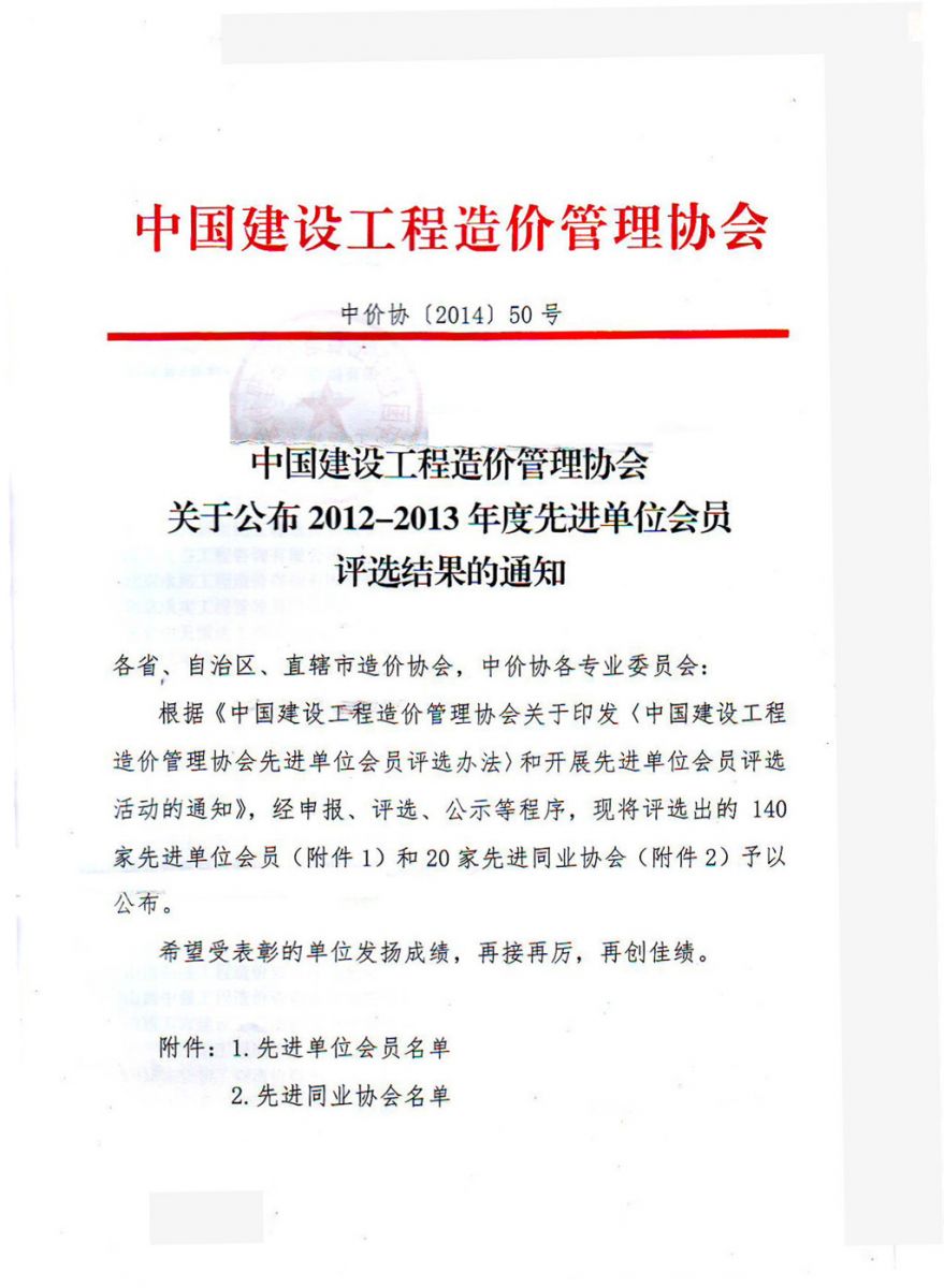 慶祝我司獲得中國建設工程造價管理協(xié)會“2012-2013年度先進單位會員”榮譽稱號。