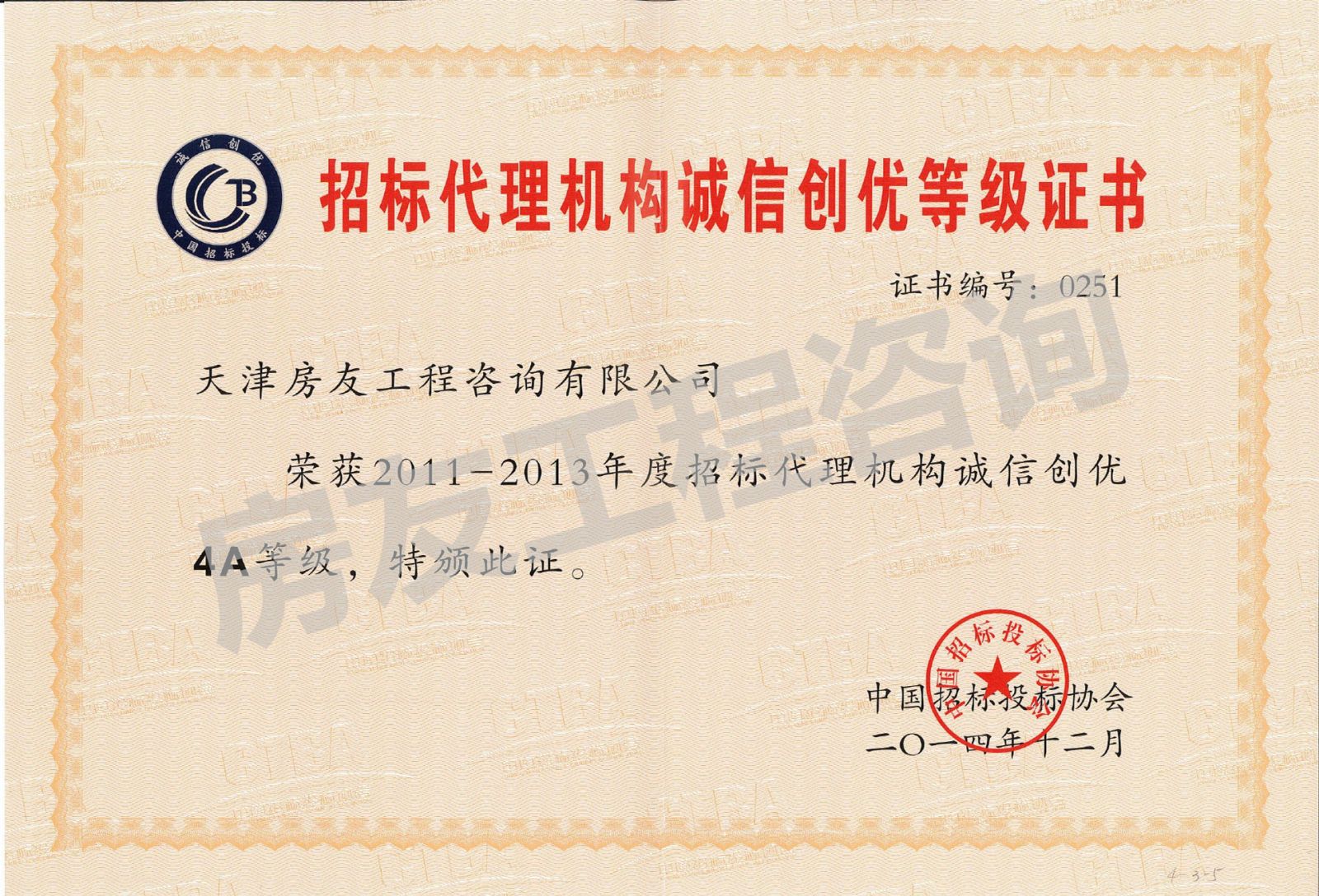 2014年12月28日,中國招標投標協(xié)會在北京召開了2014年招標代理機構(gòu)誠信創(chuàng)優(yōu)總結(jié)大會,全國各地共計388家招標代理公司分獲5A、4A、3A等級“招標代理機構(gòu)誠信創(chuàng)優(yōu)先進單位”稱號,房友咨詢連續(xù)兩屆榮獲此榮譽稱號。