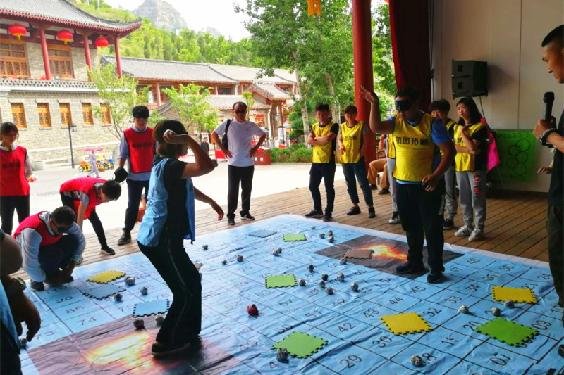 地面上分布著模擬雷區(qū),每隊選出一名指揮官和六名士兵,士兵蒙上眼睛無法認清“戰(zhàn)場敵情”,必須別無他心完全聽令于指揮官去擊退敵方。