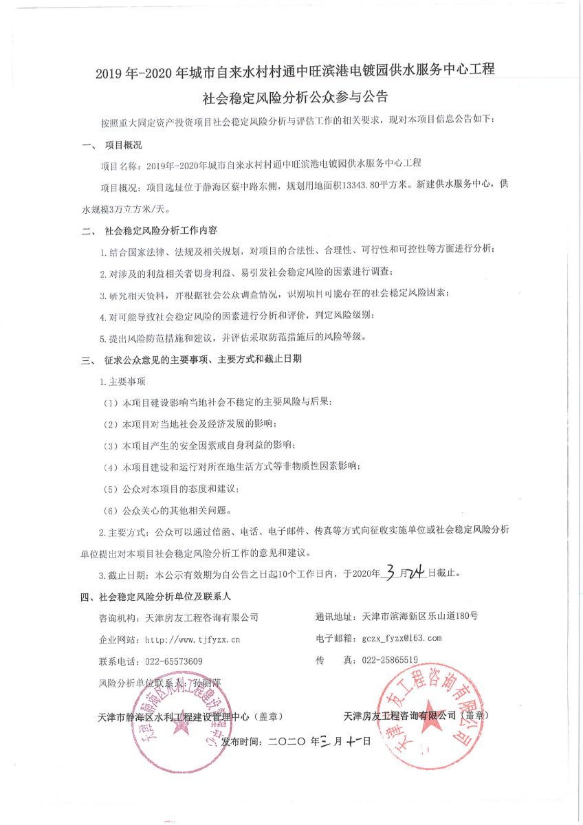 2019年-2020年城市自來水村村通中旺濱港電鍍園供水服務(wù)中心工程社會穩(wěn)定風(fēng)險(xiǎn)分析公眾參與公告