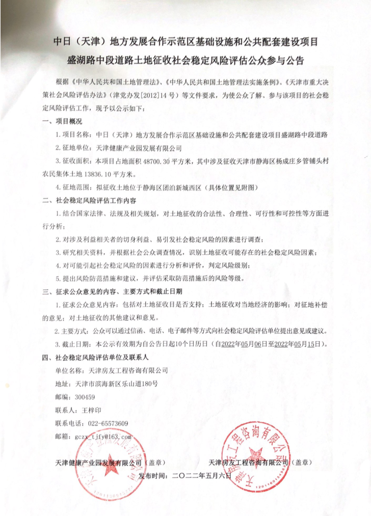 中日(天津)地方發(fā)展合作示范區(qū)基礎設計和公共配套建設項目盛湖路中段道路土地征收社會穩(wěn)定風險評估公眾參與公告