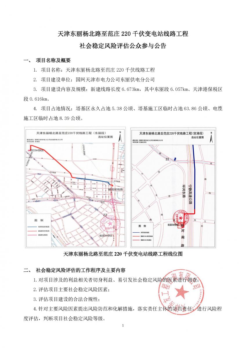 天津東麗楊北路至范莊220千伏變電站線路工程社會(huì)穩(wěn)定風(fēng)險(xiǎn)評(píng)估公眾參與公告