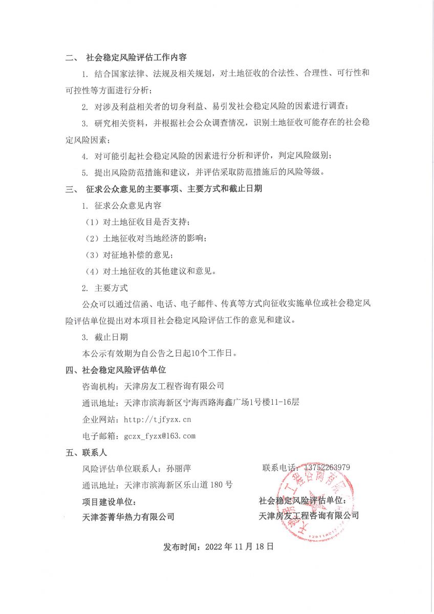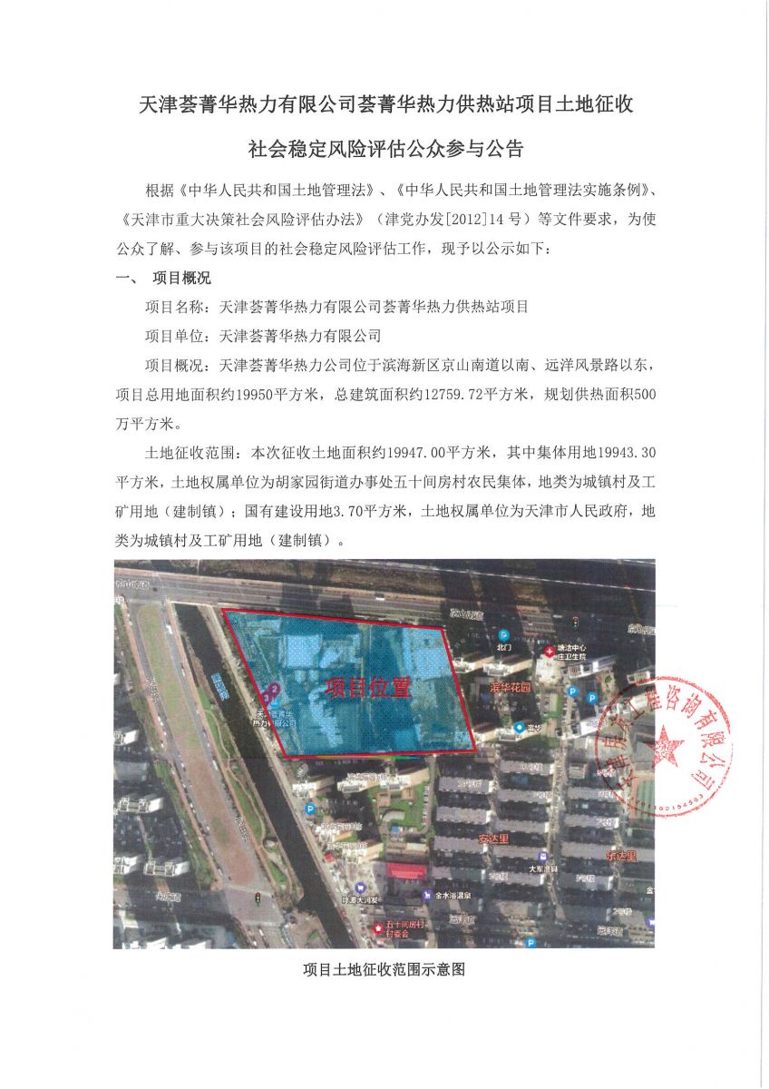 天津薈菁華熱力有限公司薈菁華熱力供熱站項目土地征收社會穩(wěn)定風(fēng)險評估公眾參與公告