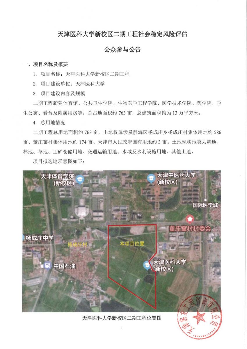 天津醫(yī)科大學(xué)新校區(qū)二期工程社會穩(wěn)定風(fēng)險評估公眾參與公告