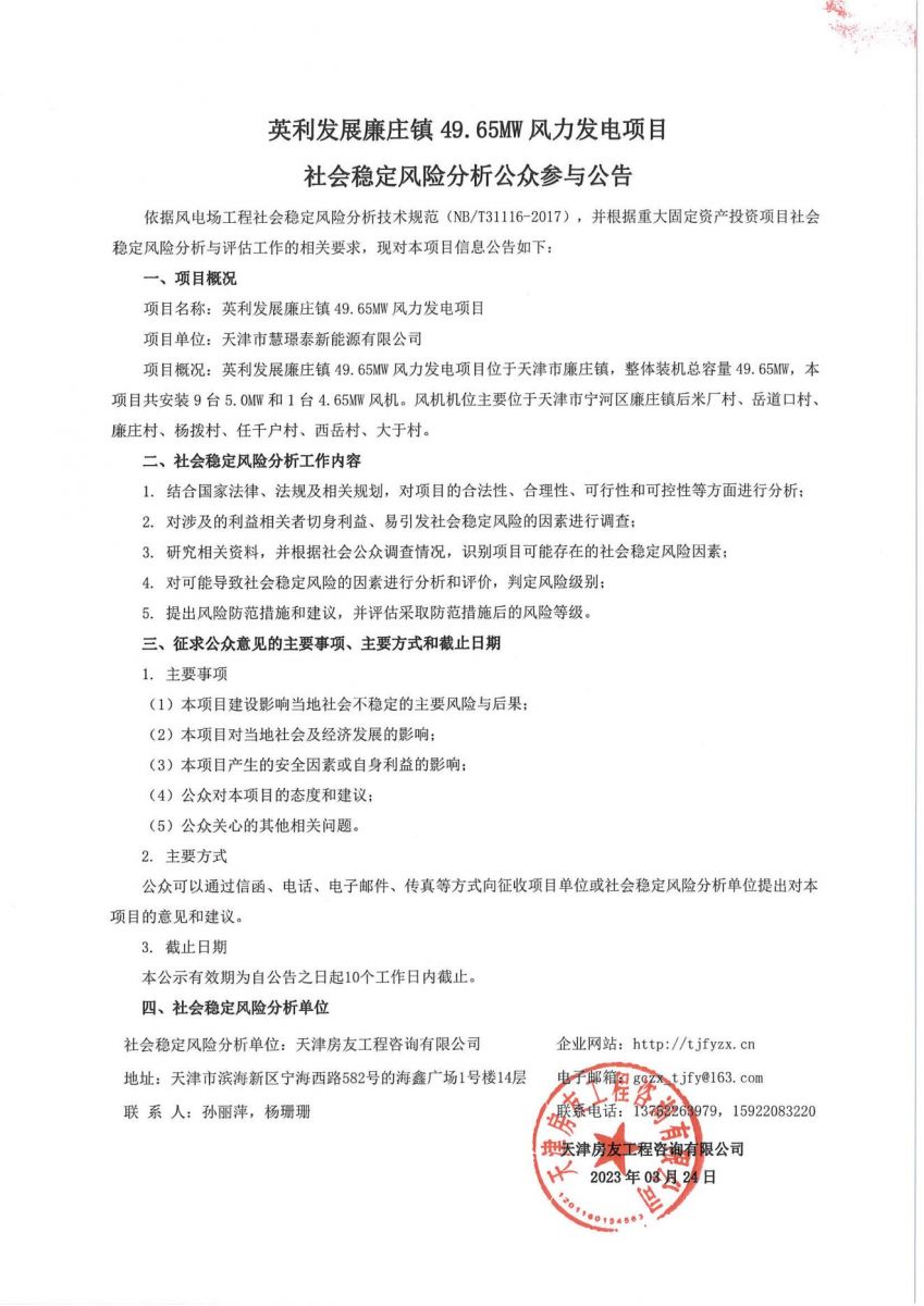 英利發(fā)展廉莊鎮(zhèn)49.65MW風(fēng)力發(fā)電項(xiàng)目社會(huì)穩(wěn)定性風(fēng)險(xiǎn)分析公眾參與公告