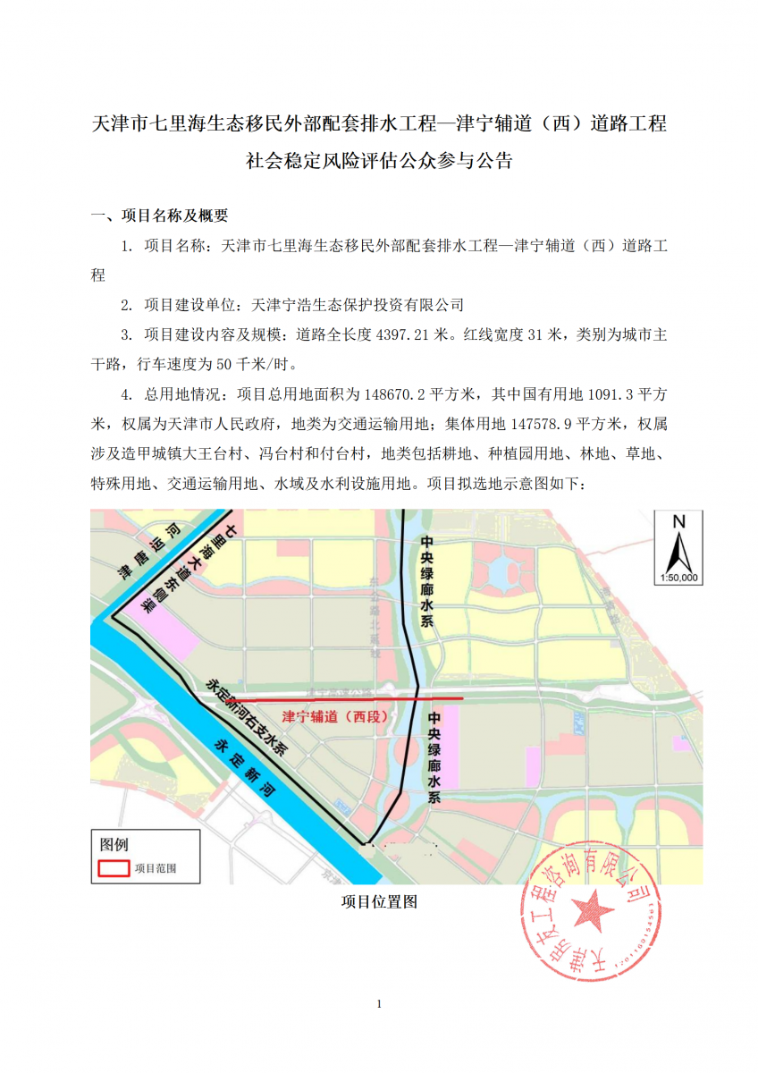 天津市七里海生態(tài)移民外部配套排水工程一津?qū)庉o道(西)道路工程社會(huì)穩(wěn)定風(fēng)險(xiǎn)評(píng)估公眾參與公告